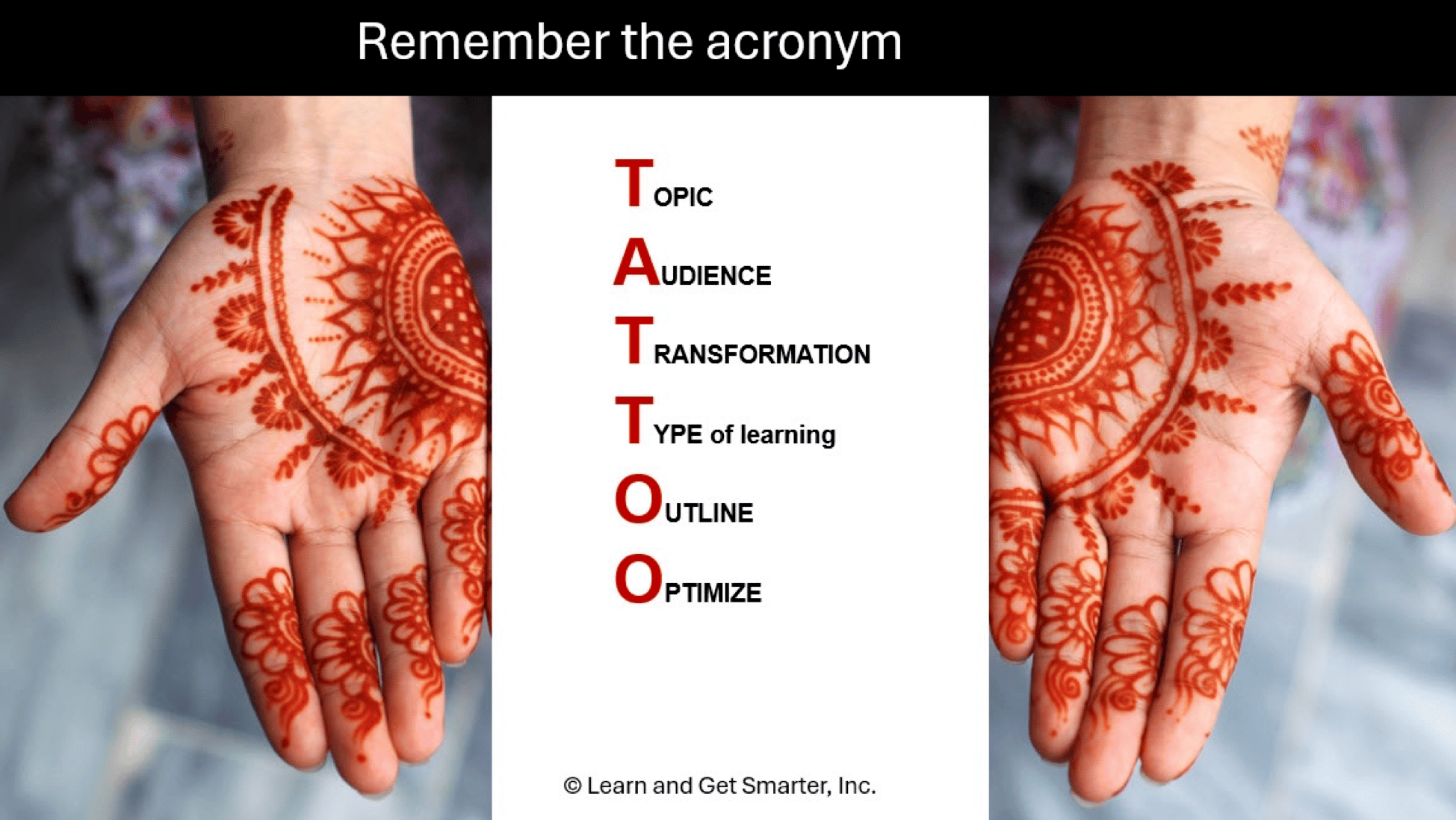 I recently started reading Rebecca Frost Cuevas's Course Design Formula® , which I recommend if you're currently offering courses or workshops or are interested in doing so. Rebecca is the Founder and CEO of Learn and Get Smarter, Inc., and is a leading online learning education consultant and trainer for experts and entrepreneurs. Here's the thing I really love about Rebecca's process and strategy, it's not just for courses. I always say that marketing is education and that you have to keep educating your prospects and customers throughout their journey with you. I'm excited to share Rebecca's process for crafting an effective lead magnet—a free resource you offer your audience in exchange for their information—based on her winning strategy. When done right, a lead magnet not only grows your email list but also showcases your expertise and gives potential customers a "quick win." Since you want the message in your lead magnet to stick, think of it as a “TATTOO.”